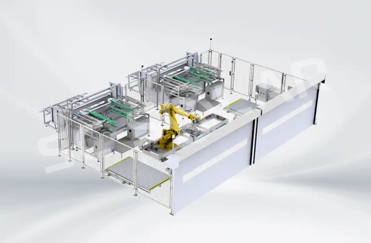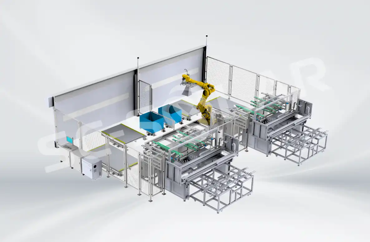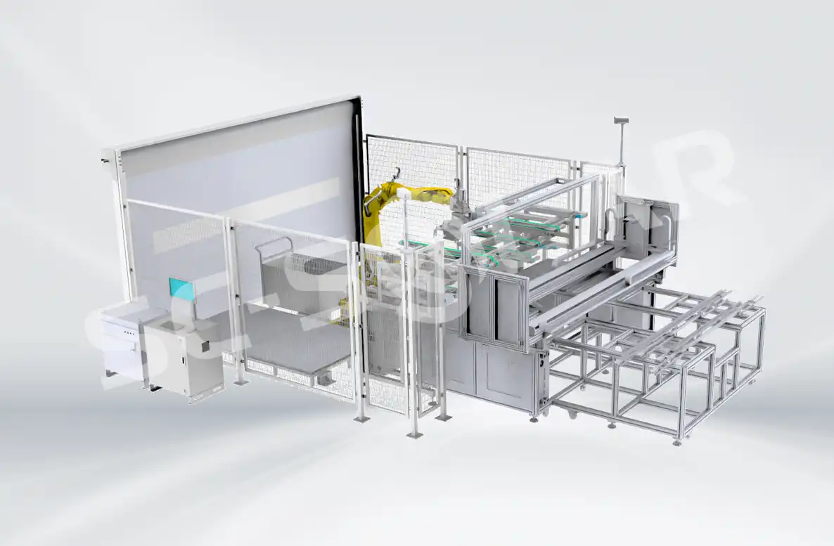 在光伏组件制造领域,智能化与无人化的深入应用正不断推动行业升级,重塑生产模式。随着光伏组件制造向高效、智能、柔性化方向迈进,HJC黄金城集团光伏凭借深厚的技术积淀与前瞻性布局,研发并推出整托边框上料机。该设备分为1vs1和1vs2两个版本,可以实现边框自动检测、抓取、上料、分料等工序,大幅提升生产效率,有效降低企业用工成本。