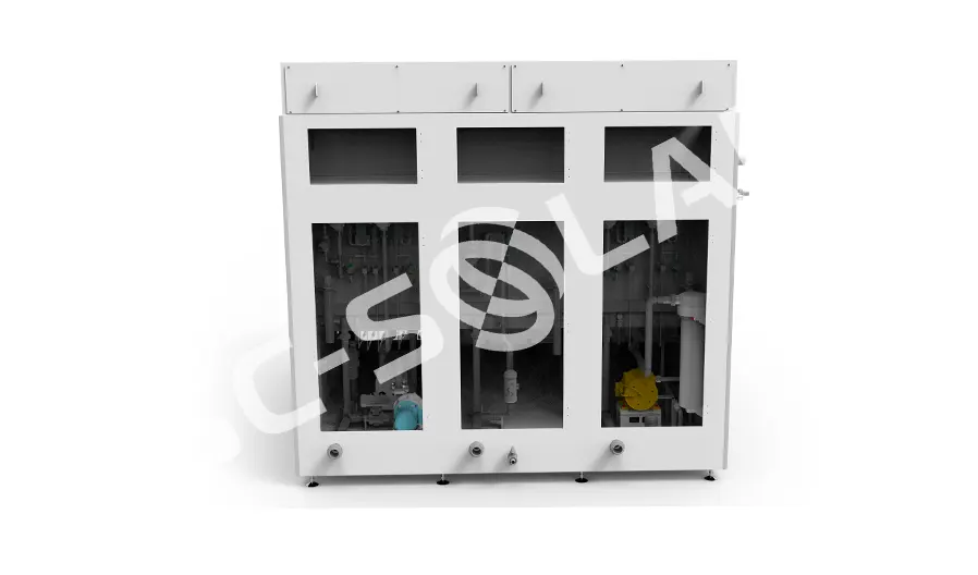 进液匀流结合压力腔与多层匀流板组成快速平稳的布液系统; 自补偿动态平衡废气排风系统,提高废气排风高效性; 派单式手臂调度系统,实现生产工艺柔性化; 工业热水机采用纯石英红外加热方式,确保无金属离子析出; 酸碱区域采用自动闸门隔离,解决气体串流现象; 烘干区采用化学过滤主动新风系统,保证O3气体浓度<10ppb.